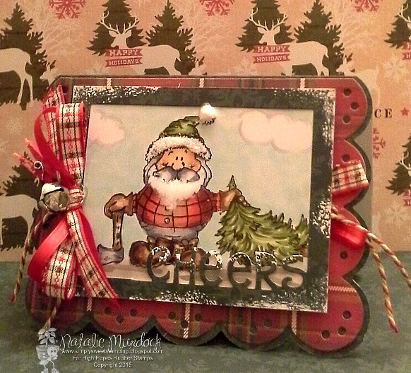 Two embossing folders were used to help create a snowy scene. The hill was hand cut and Santa is pop dotted for extra dimension. A friend of mine gave me the Merry Christmas Die cut which I LOVE (thank you J)! I added a bit of glitter and slightly curved the words almost like Santa is holding the greeting.
