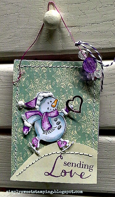 The conversation hearts are stamped with Tim Holtz Festive berries. Red twine and Valentines gem hearts for some extra love. I though that a hand written note could be added to each tag! :)